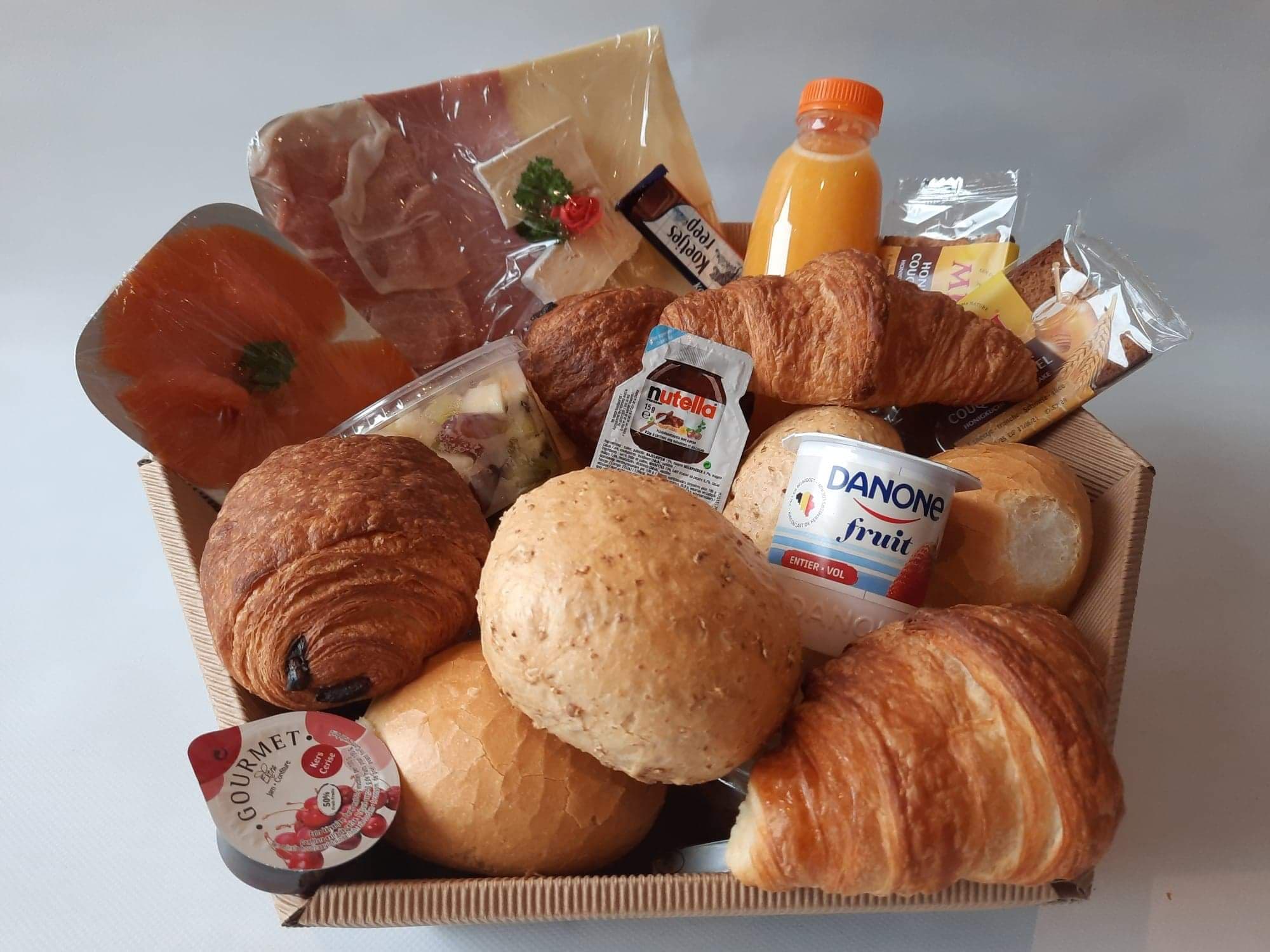 Trakteer jezelf of een geliefde op een onvergetelijke start van de dag met een heerlijk en gezond ontbijt. Het perfecte cadeau voor moederdag, of gewoon om jezelf eens goed te verwennen. Dit zorgvuldig samengestelde pakket bevat alles wat je nodig hebt voor een heerlijke en luxe ochtendmaaltijd. Inhoud: 2 x Pistolets, 1 x Chocoladebroodje, 1 x Croissant, 1 sneetje kaas, 1 sneetjes hesp, 1 portie preparé, 1 portie kip curry, 1 gekookt ei, 1 potje confituur, 1 potje choco, 1 portie boter, 1 x sinaasappelsap, 1 zakje thee, 1 potje Yoghurt, 1 potje granola, vers fruit, (de getoonde foto kan afwijken van de beschrijving)